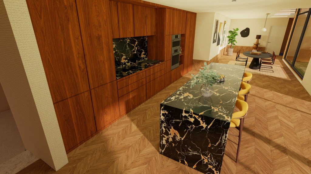 Les façades en bois des meubles de cuisine créent une base sobre et chaleureuse, complétée par un sol en parquet à chevrons qui apporte continuité et confort visuel. L’îlot en marbre noir veiné structure l’ensemble et devient un vrai point de rassemblement pour la famille et entre amis.