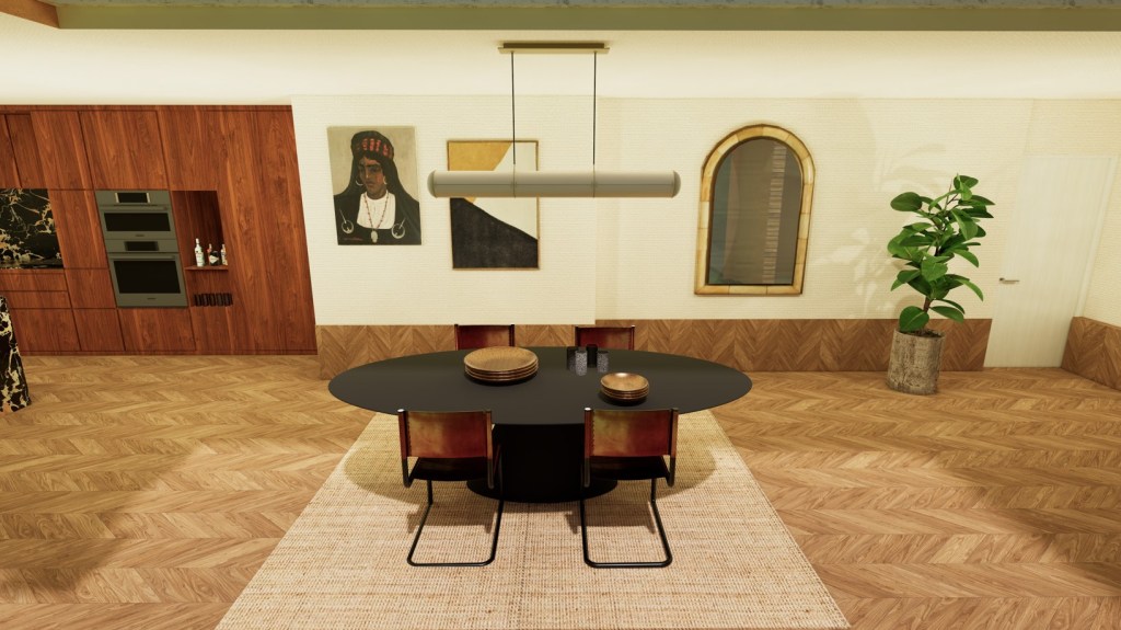 La palette associe donc la profondeur du bois, la force minérale du marbre et l’énergie des couleurs vives, équilibrées par la touche végétale d’une plante en pot. Le résultat est un espace qui soutient à la fois la convivialité et le confort, dans une logique durable, sophistiquée et cohérente avec le quotidien des habitants.