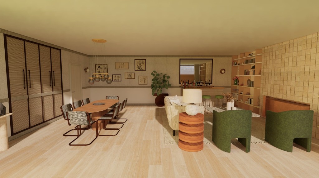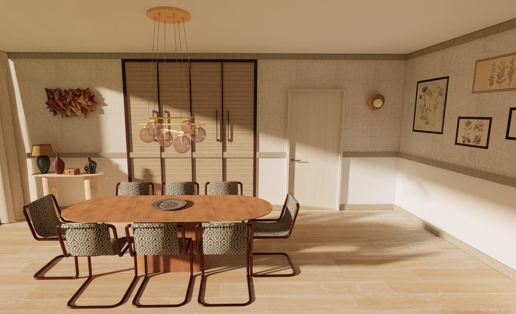 PROJET : Cet espace de vie a été entièrement repensé pour créer une atmosphère conviviale et harmonieuse. Les propriétaires souhaitaient un lieu où cohabitent un salon chaleureux, une salle à manger accueillante et un coin bar/bibliothèque, dans une continuité fluide et pratique.