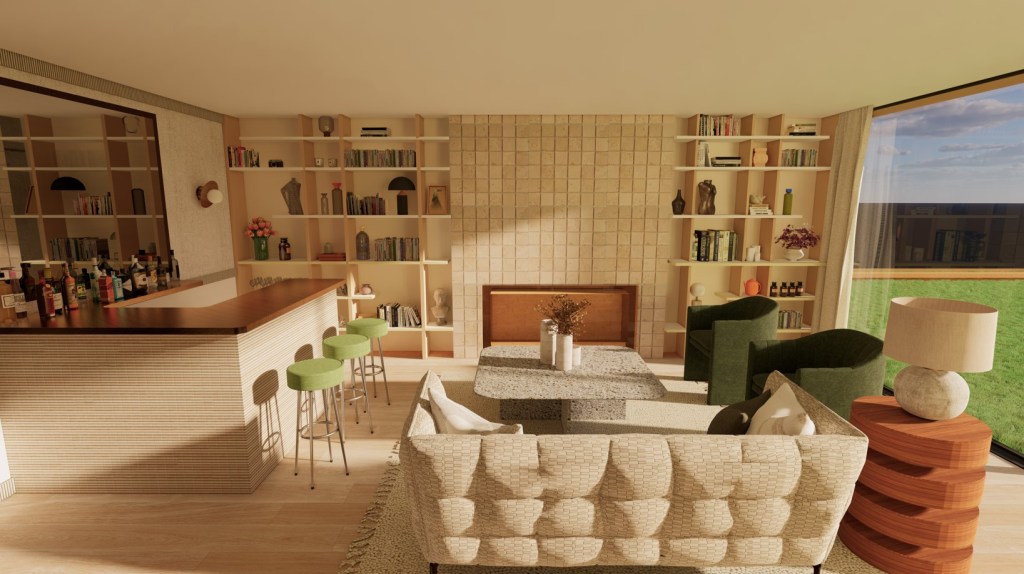 Dans le salon, le choix des fauteuils verts et du canapé texturé soutient une ambiance apaisante. Le vert, associé à la nature, invite à la détente, tandis que les matières douces renforcent la dimension cocooning.